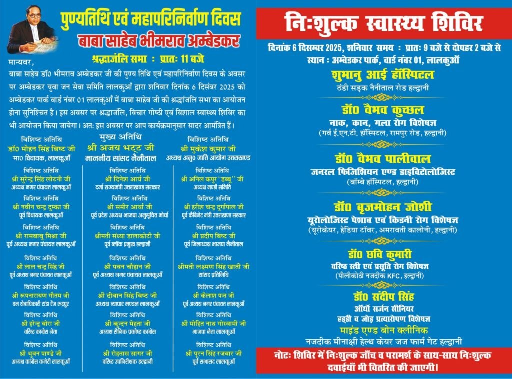 लालकुआँ में आगामी 6 दिसंबर को बाबा साहब डॉ. भीमराव अंबेडकर की पुण्यतिथि एवं महापरिनिर्वाण दिवस पर इस बार कुछ अलग और भव्य देखने को मिलेगा। अंबेडकर पार्क में सुबह 9 बजे से दोपहर 2 बजे तक विशाल स्वास्थ्य शिविर लगाया जा रहा है, जिसमें हल्द्वानी के कई प्रतिष्ठित अस्पतालों के वरिष्ठ चिकित्सक अपनी सेवाएँ देंगे। खास बात यह है कि सभी जांचें और दवाइयाँ पूरी तरह निशुल्क होंगी, जबकि आंखों की हाईटेक मशीनों से विशेष जांच की व्यवस्था भी की गई है।