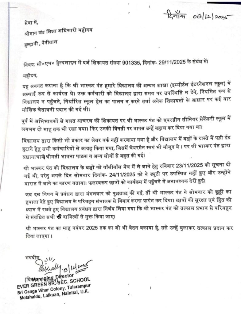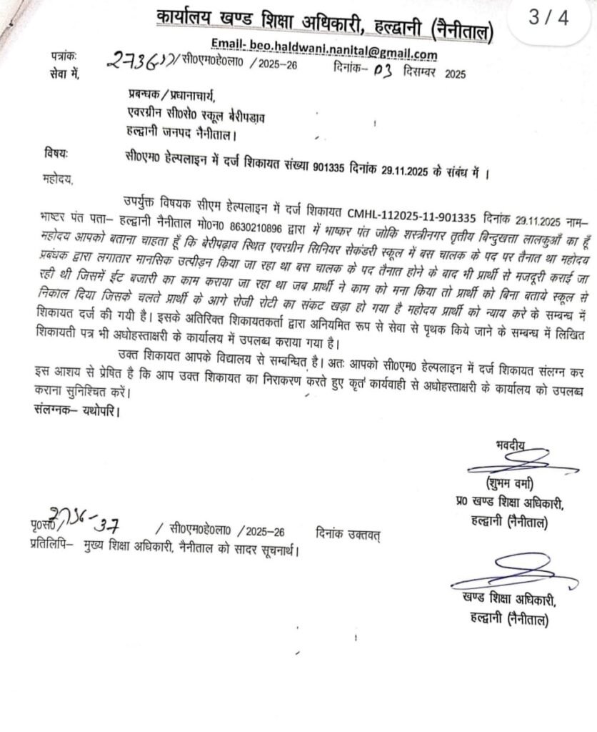 हल्द्वानी (नैनीताल)। बेरीपड़ाव स्थित एवरग्रीन सीनियर सेकेंडरी स्कूल में तैनात बस चालक भाष्कर पंत द्वारा लगाए गए मानसिक उत्पीड़न, मजदूरी कराने और बिना सूचना सेवा से पृथक करने के आरोपों पर शिक्षा विभाग हरकत में आ गया है। प्रकरण सीएम हेल्पलाइन में शिकायत संख्या 9013358 के रूप में दर्ज हुआ था।