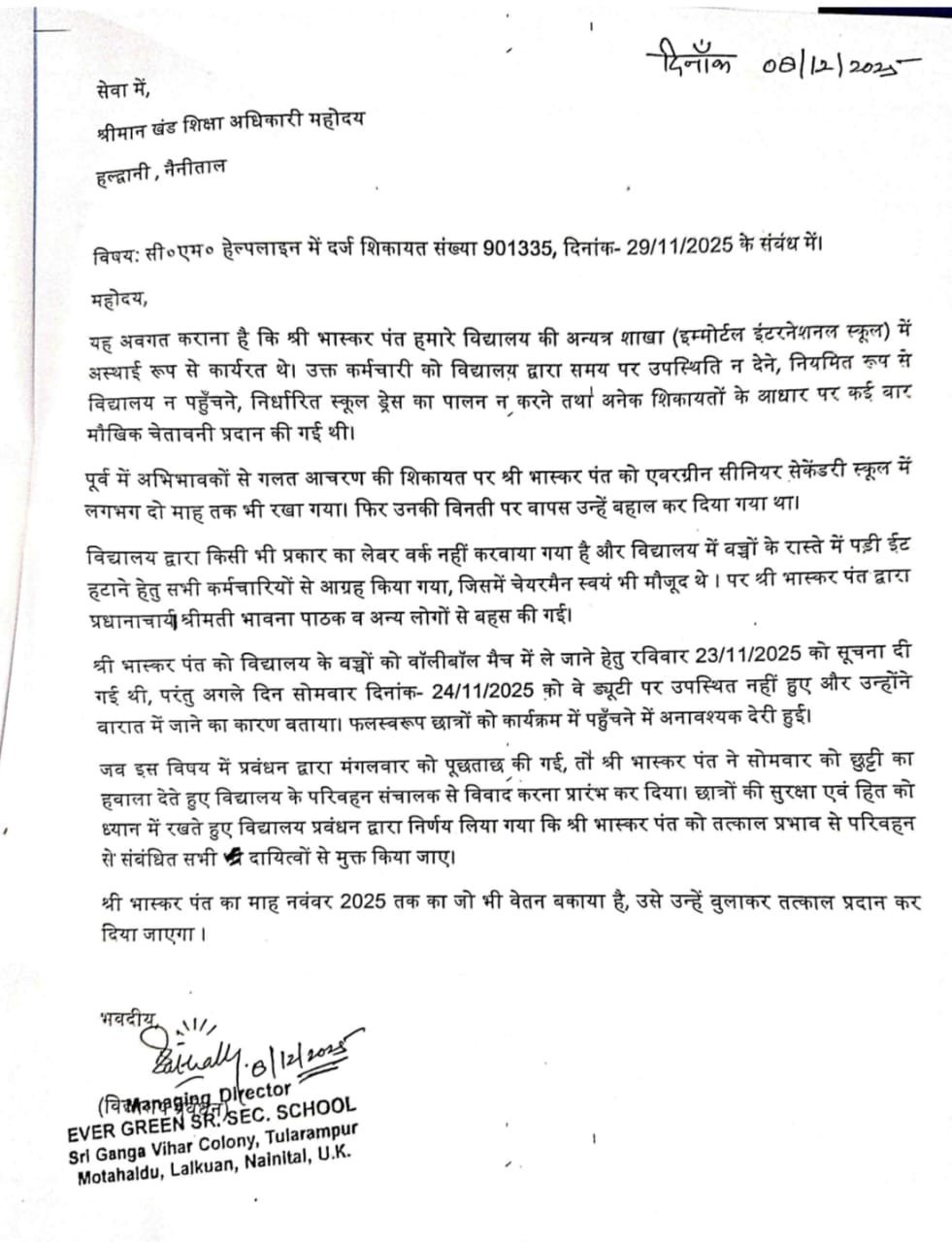 शिकायत की जांच के लिए खंड शिक्षा अधिकारी, हल्द्वानी द्वारा पत्रांक 2736-37, 03 दिसम्बर 2025 को स्कूल प्रबंधक/प्रधानाचार्य से आख्या मांगी गई। प्रबंधन ने जवाब में बताया कि छात्रों की सुरक्षा एवं हित को देखते हुए भाष्कर पंत को तत्काल प्रभाव से परिवहन संबंधी दायित्वों से मुक्त किया गया है। साथ ही उन्हें नवम्बर 2025 तक का बकाया वेतन बुलाकर प्रदान करने की बात कही गई है।