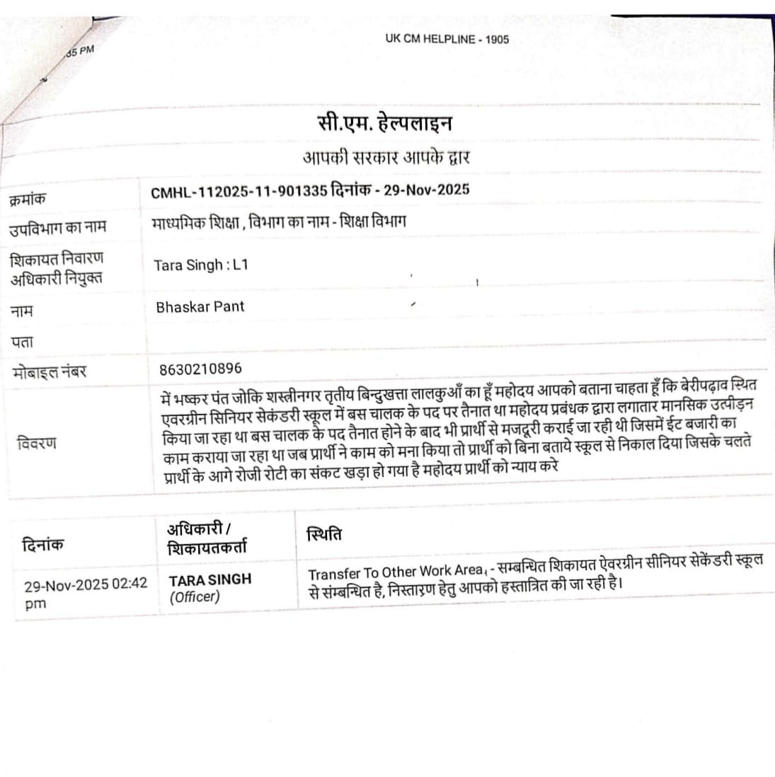 हल्द्वानी (नैनीताल)। बेरीपड़ाव स्थित एवरग्रीन सीनियर सेकेंडरी स्कूल में तैनात बस चालक भाष्कर पंत द्वारा लगाए गए मानसिक उत्पीड़न, मजदूरी कराने और बिना सूचना सेवा से पृथक करने के आरोपों पर शिक्षा विभाग हरकत में आ गया है। प्रकरण सीएम हेल्पलाइन में शिकायत संख्या 9013358 के रूप में दर्ज हुआ था।