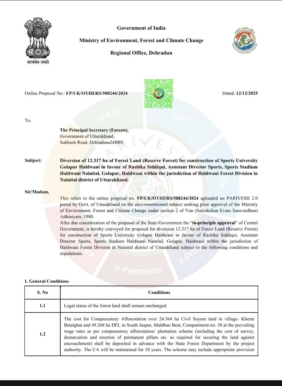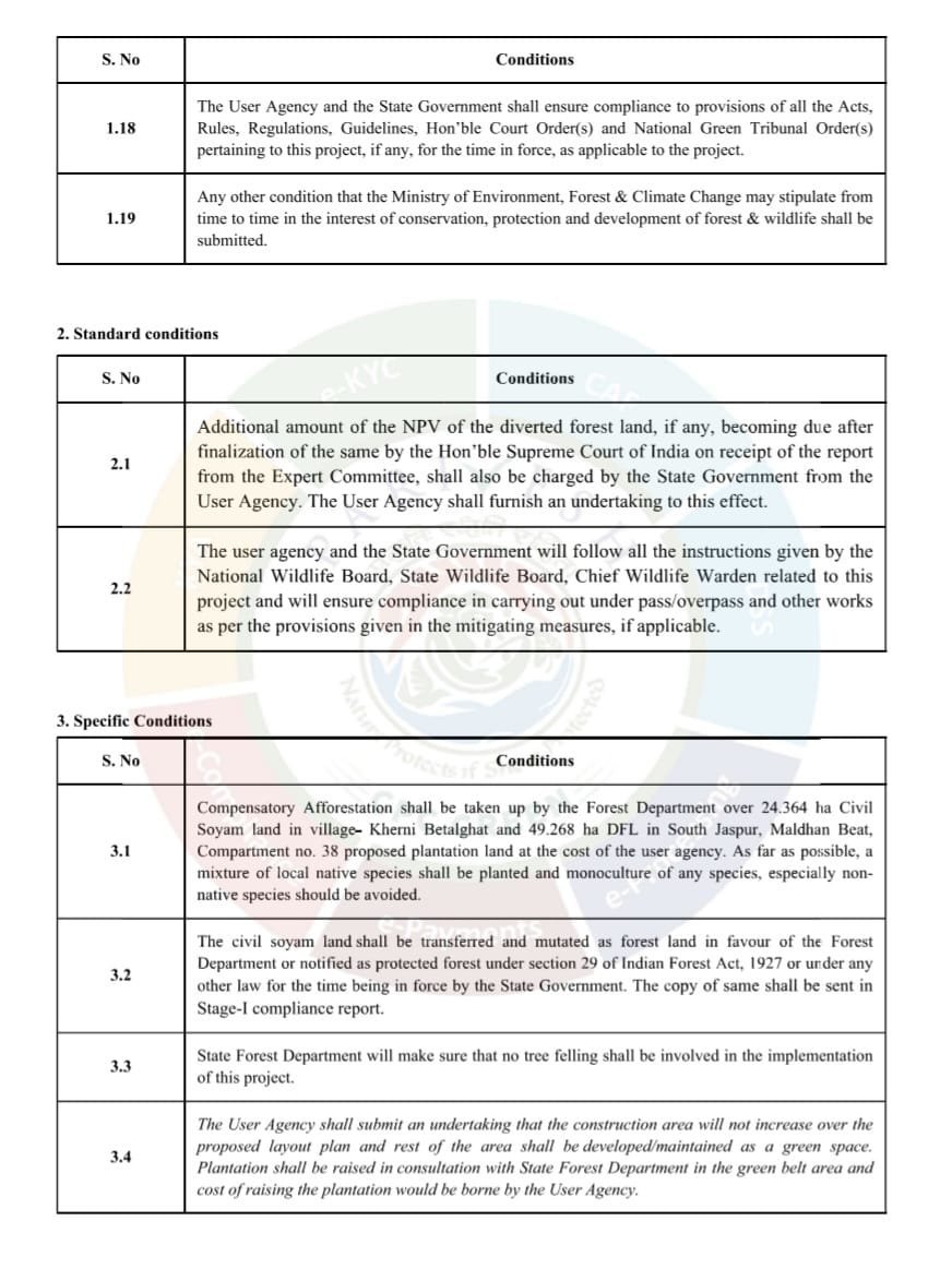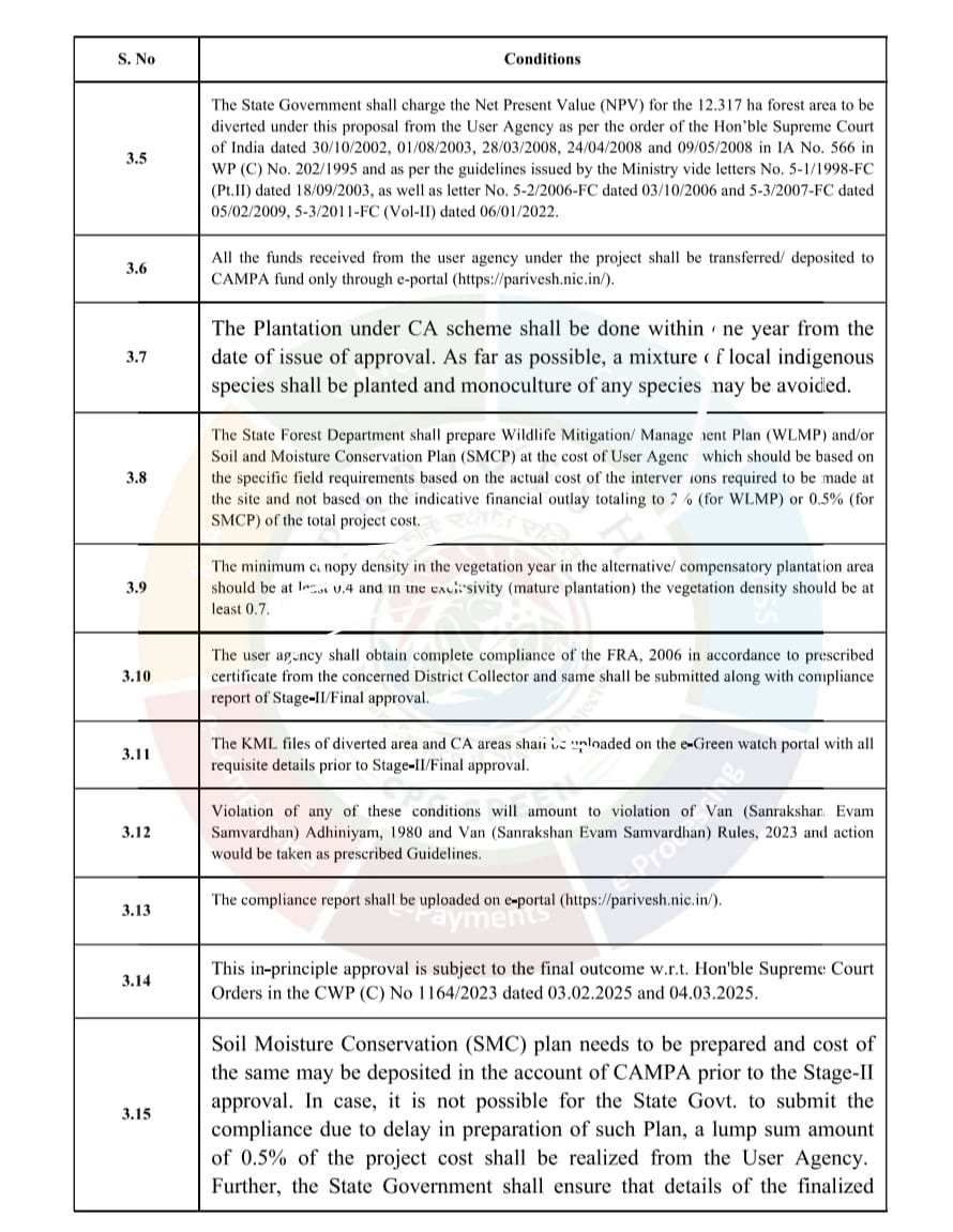 पत्र में वन संरक्षण एवं संवर्धन अधिनियम 1980 की धारा-2 के तहत यह मंजूरी दी गई है। इसमें स्पष्ट किया गया है कि वन भूमि का कानूनी दर्जा अपरिवर्तित रहेगा और कोई अतिरिक्त मार्ग नहीं बनाया जाएगा।