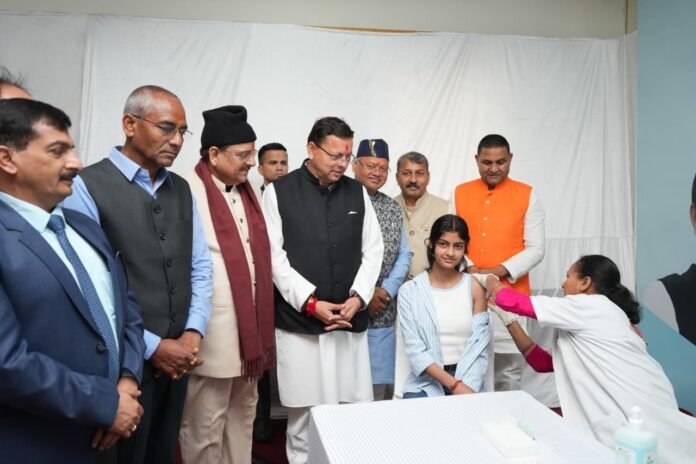 मुख्यमंत्री ने बताया कि राजस्थान के अजमेर से प्रधानमंत्री द्वारा प्रारंभ किए गए इस अभियान के अंतर्गत देशभर में 14 वर्ष की लगभग 1 करोड़ 15 लाख से अधिक किशोरियों को मुफ्त एचपीवी वैक्सीन दी जाएगी। मुख्यमंत्री ने कहा कि उत्तराखंड राज्य में भी इस अभियान के प्रथम चरण में 155 केंद्रों पर व्यापक स्तर पर टीकाकरण की व्यवस्था सुनिश्चित की गई है। इस अभियान की सफलता के लिए डॉक्टरों, नर्सों, एएनएम, आशा और आंगनवाड़ी कार्यकर्ताओं को प्रशिक्षित किया गया है ताकि कोल्ड-चेन व्यवस्था मजबूत हो।