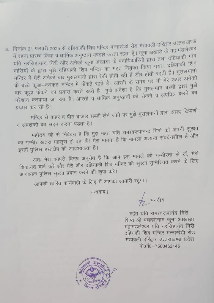 आज दहियाकी शिव मंदिर के महंत यति रामस्वरूप गिरी मंगलौर थाने में जाकर इस्लामीक कट्टरपंथी जिहादियों से अपने प्राणों की रक्षा के लिए गुहार लगाई यति रामस्वरूपानंद गिरि को कट्टरपंथी जिहादियों ने अनेकों बार मारने का प्रयास किया ।
