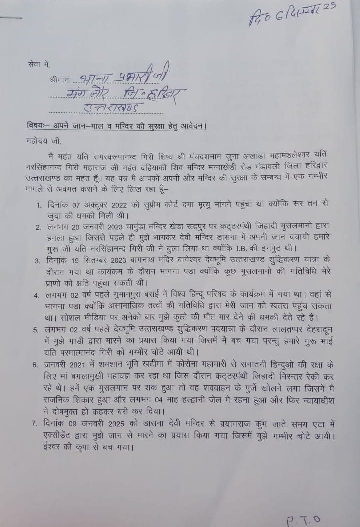 आज दहियाकी शिव मंदिर के महंत यति रामस्वरूप गिरी मंगलौर थाने में जाकर इस्लामीक कट्टरपंथी जिहादियों से अपने प्राणों की रक्षा के लिए गुहार लगाई यति रामस्वरूपानंद गिरि को कट्टरपंथी जिहादियों ने अनेकों बार मारने का प्रयास किया ।