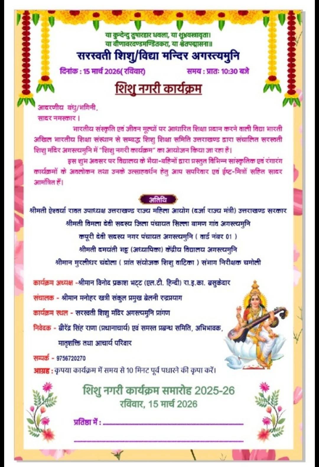 खबर है रूद्रप्रयाग जिले व अगस्त्यमुनि ब्लॉक से आपको बता दें कि रविवार को सरस्वती शिशु मंदिर अगस्त्यमुनि द्वारा शिशु नगरी वाटिका महोत्सव कार्यक्रम किया गया जिसमें छात्र छात्राओं द्वारा रंगारंग कार्यक्रम किया गया वहीं विघालय के प्रधानाचार्य बीरेंद्र सिंह राणा ने बताया कि सरस्वती शिशु मंदिर के कक्षा नर्सरी से लेकर कक्षा द्वितीय कक्षा के छात्र छात्राओं द्वारा स्वयं कार्यक्रम किया गया जिस कार्यक्रम को देखने समस्त छात्र छात्राओं के अभिभावकों की उपस्थिति अहम् रही प्रधानाचार्य बीरेंद्र सिंह राणा ने कहा कि इस कार्यक्रम में छात्र छात्राओं द्वारा कुल 12 कार्यक्रम किया गया जिसमें चित्रलेखा पुस्तकालय, विज्ञान प्रयोगशाला, वस्तु प्रयोगशाला, चिण्डिया घर, वगीचा कार्यशाला के साथ विभिन्न कार्यक्रम आयोजित किया गया
